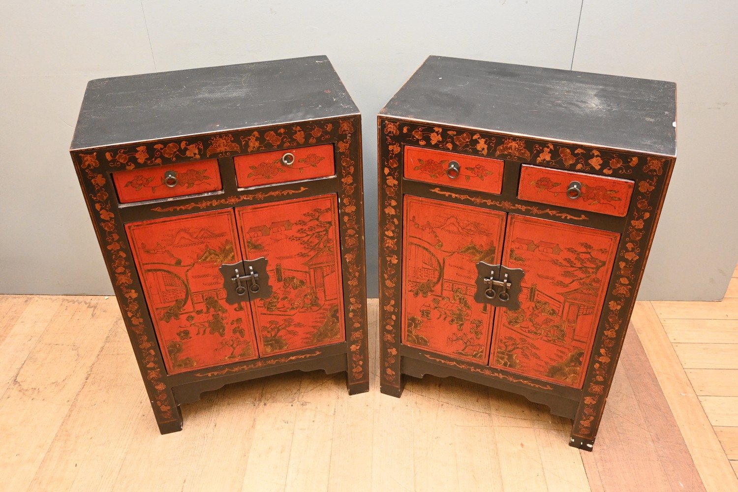 A PAIR OF CHINESE BLACK AND SCARLET-LACQUERED SIDE CABINETS (A/F) (85H X 58W X 38D CM) (LEONARD JOEL DELIVERY SIZE: X-LARGE)
