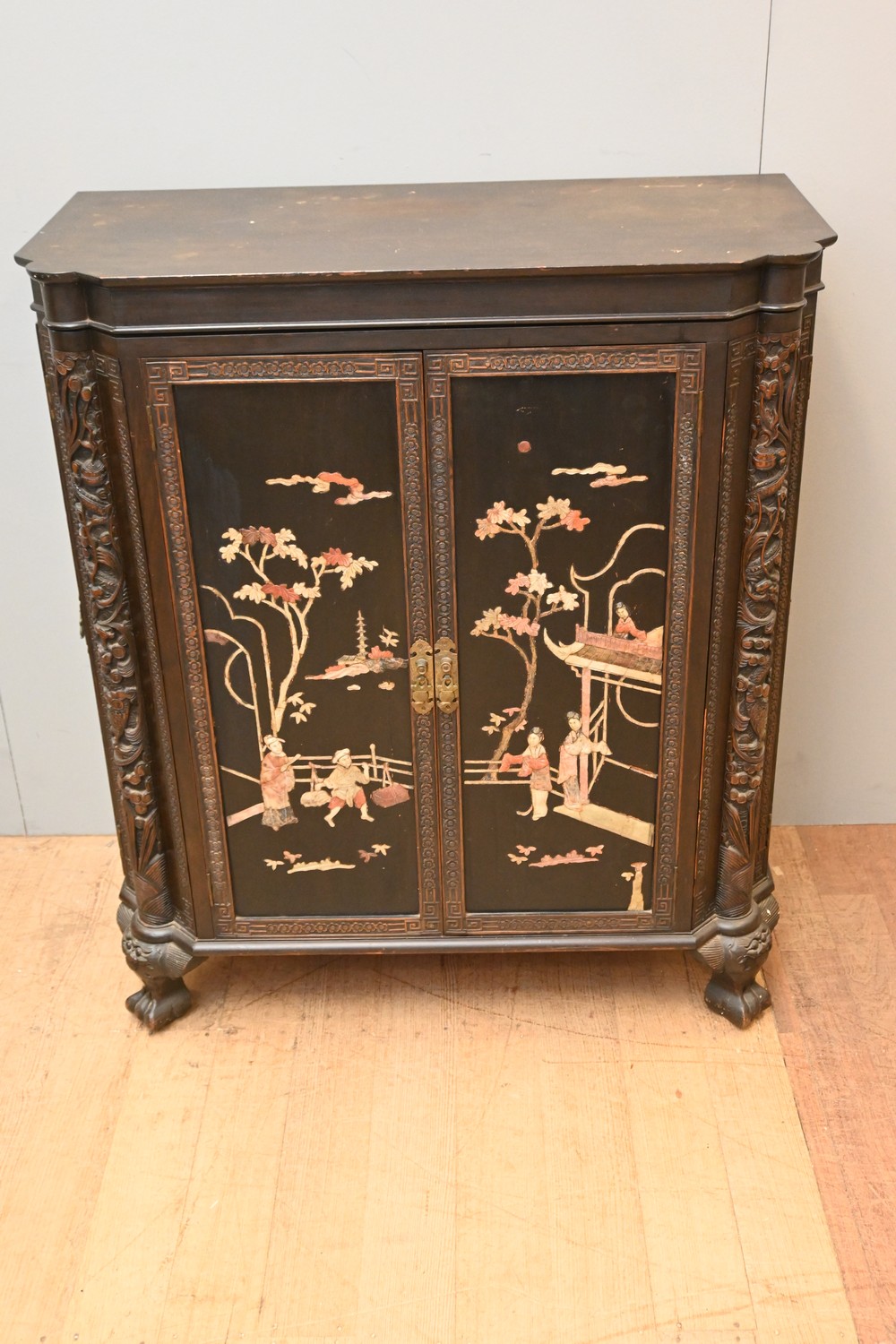 A CHINESE HARDWOOD COCKTAIL CABINET, WITH APPLIED STONE DECORATION, WITH A HINGED TOP AND DOORS TO THE FRONT AND SIDES (A/F) (102H X 89W X 44D CM) (LEONARD JOEL DELIVERY SIZE: X-LARGE)