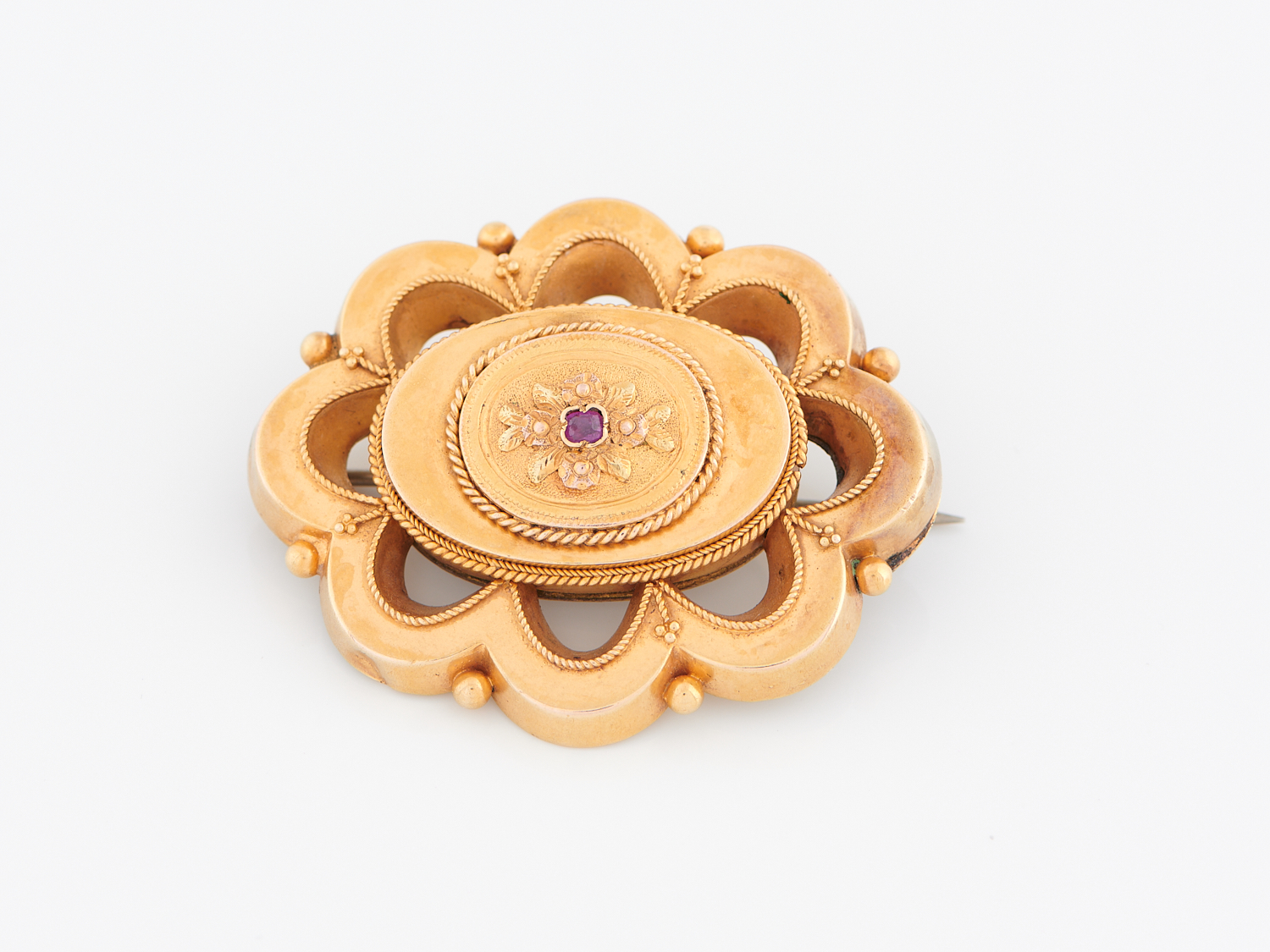 AN EARLY AUSTRALIAN BROOCH/LOCKET IN 15CT GOLD, SET WITH A SINGLE RUBY, 10.1GMS