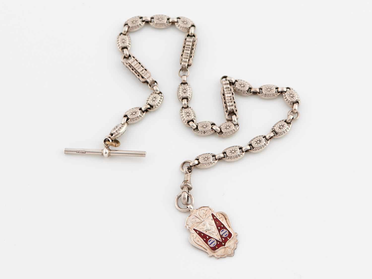 AN ANTIQUE WATCH CHAIN AND FOB IN STERLING SILVER, LENGTH 400MM