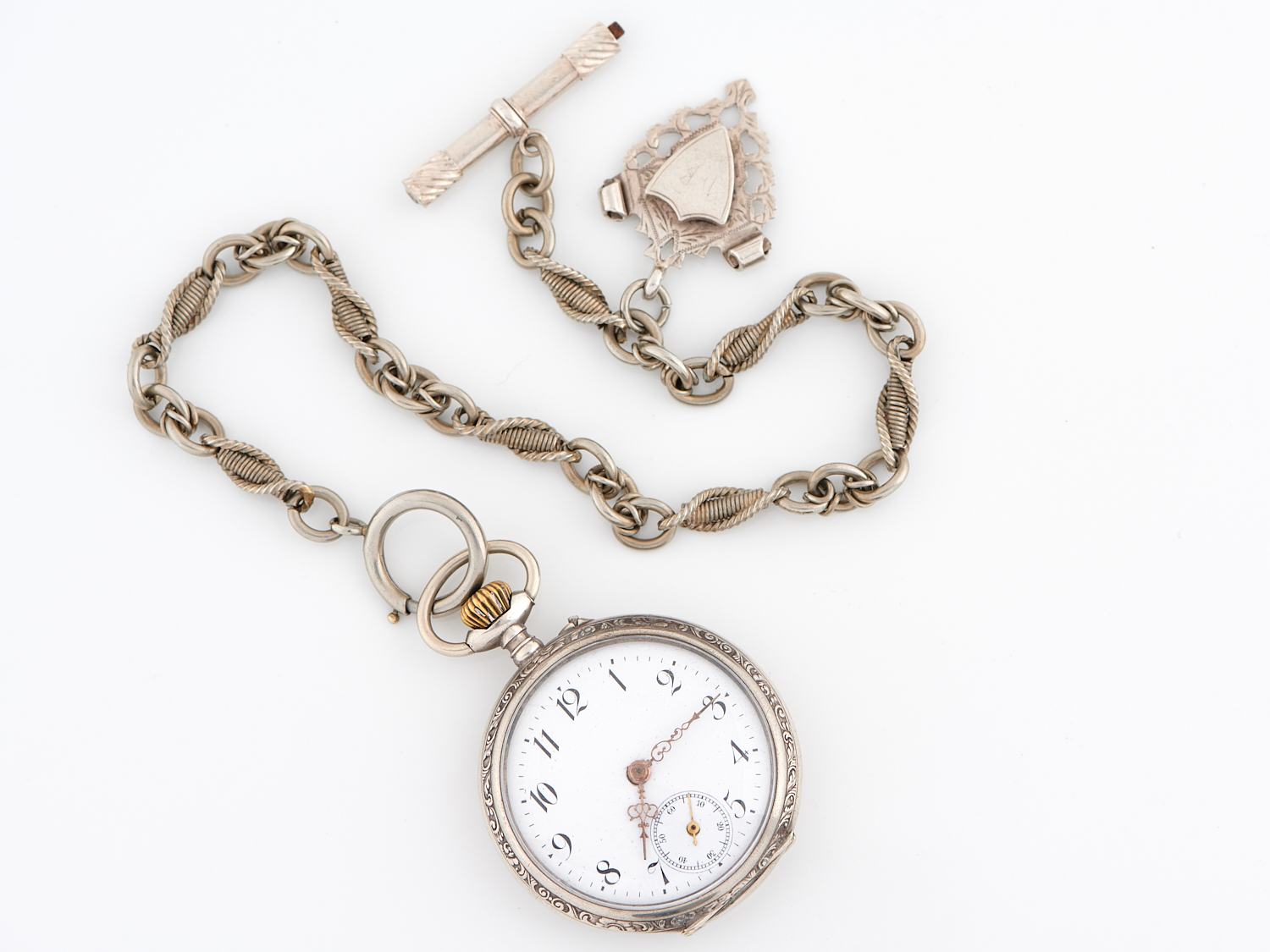 AN ANTIQUE OPEN POCKET WATCH IN SILVER TO A FOB CHAIN IN SILVER, THE CHAIN 300MM