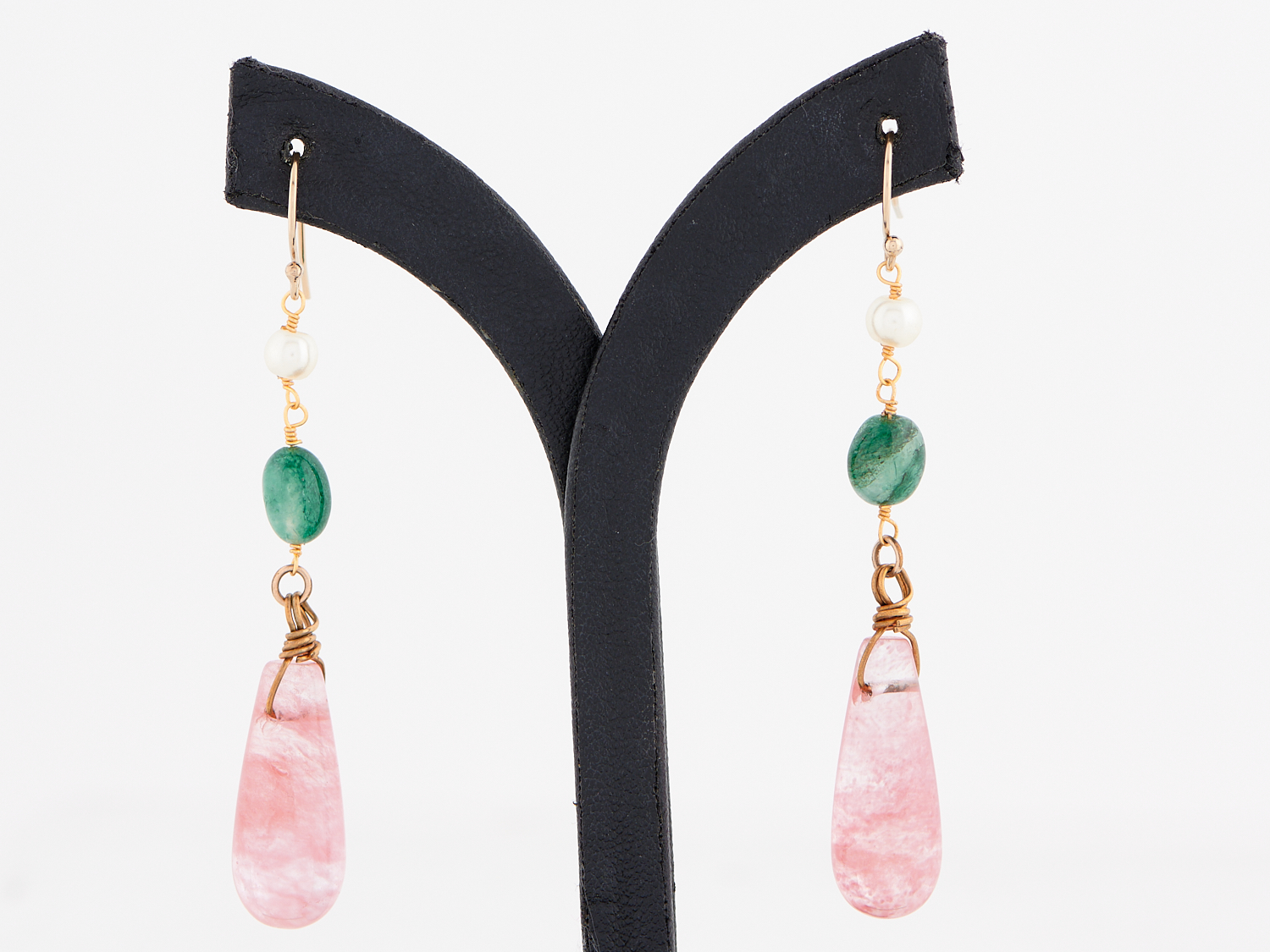 A PAIR OF QUARTZ EARRINGS SET DROP EARRINGS WITH EMERALD BEAD AND PEARL DETAIL, TO SHEPHERDS HOOK FITTINGS IN 9CT GOLD