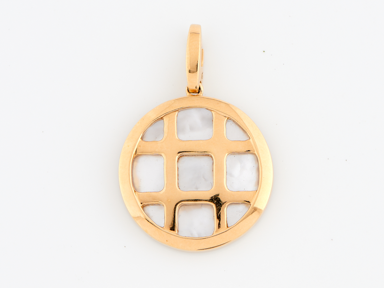 A MOTHER OF PEARL SET PENDANT IN 18CT GOLD, DIAMETER 25MM, 14.2GMS