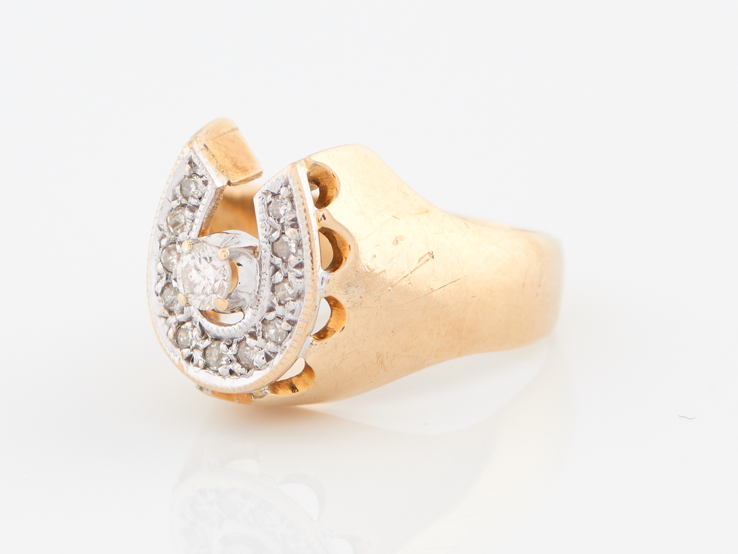 A DIAMOND SET HORSESHOE RING IN 12CT GOLD, RING SIZE J