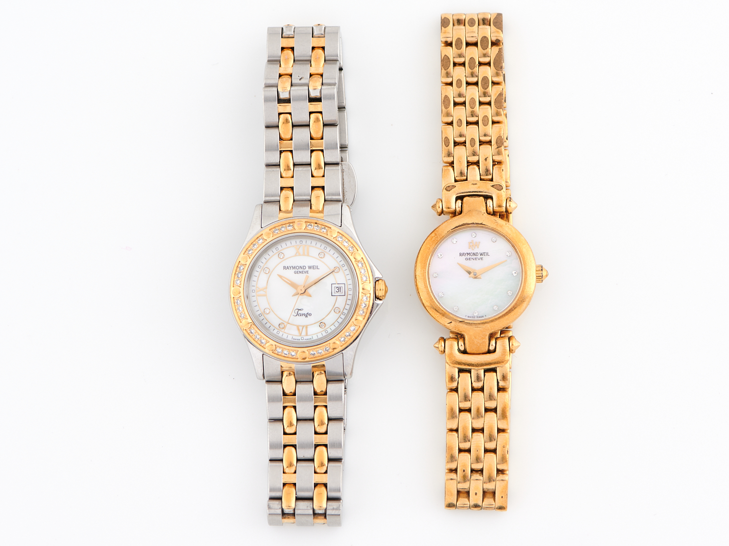 RAYMOND WEIL, TWO WRIST WATCHES FEATURING MOTHER OF PEARL DIALS, ONE IN TWO TONE STAINLESS STEEL AND DIAMOND SET BEZEL, THE OTHER IN GOLD TONE STAINLESS STEEL