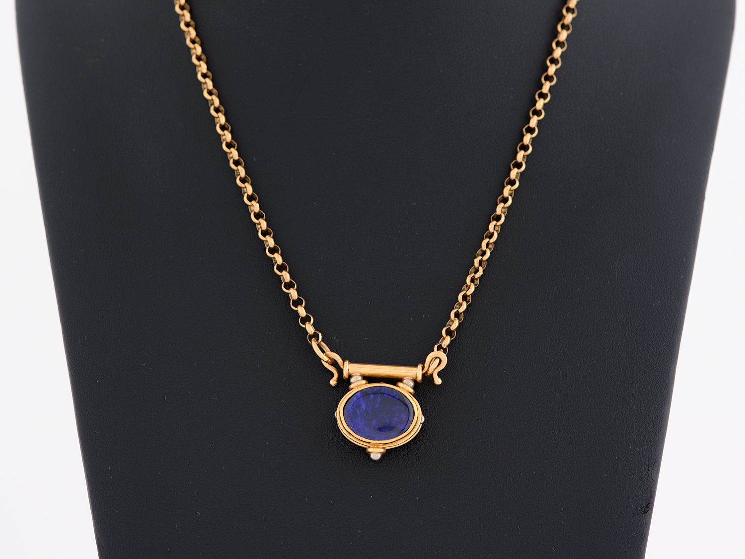 A SOLID BLACK CRYSTAL OPAL SET PENDANT IN TWO TONE 18CT GOLD, TO A CHAIN IN 9CT GOLD, CHAIN LENGTH 470MM