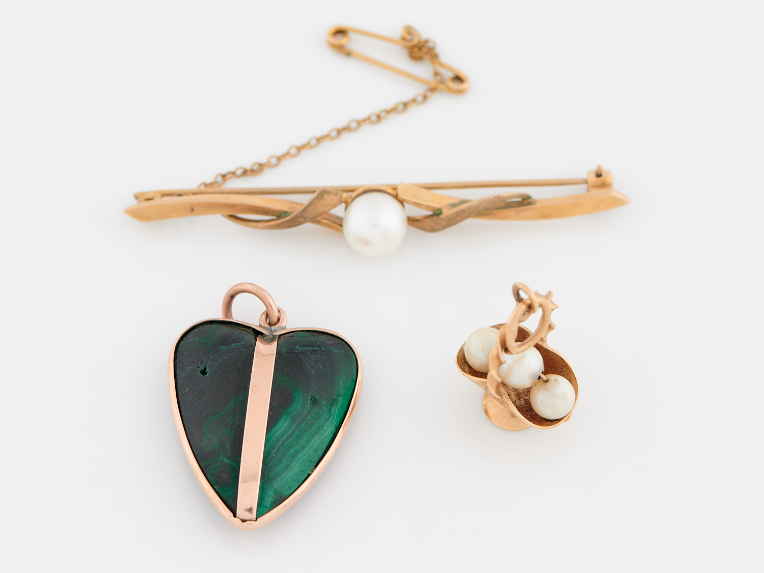 A PEARL SET BAR BROOCH IN 9CT GOLD, ALONG WITH A PEARL SET BASKET PENDANT IN 18CT GOLD AND A MALACHITE SET HEART IN 9CT GOLD
