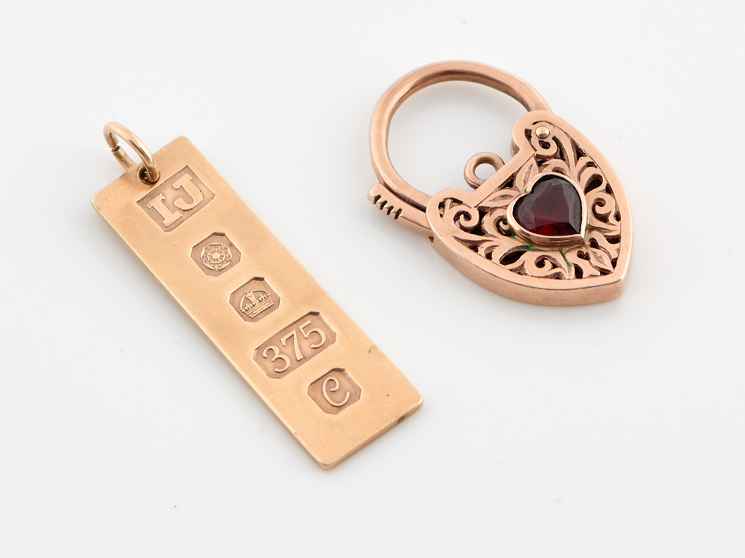 A GEM SET HEART PADLOCK IN 9CT GOLD, ALONG WITH AN INGOT PENDANT IN 9CT GOLD, 13.4GMS