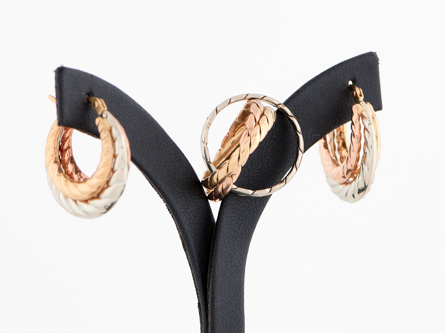 A PAIR OF HOOP EARRINGS AND A RUSSIAN WEDDER IN TRI-COLOUR 9CT GOLD, RING SIZE H/I, 7.6GMS