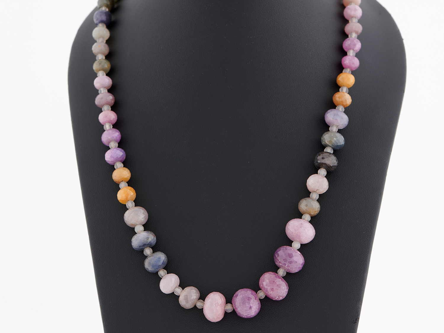 A GRADUATED MULTI COLOURED SAPPHIRE BEAD NECKLACE, LENGTH 745MM