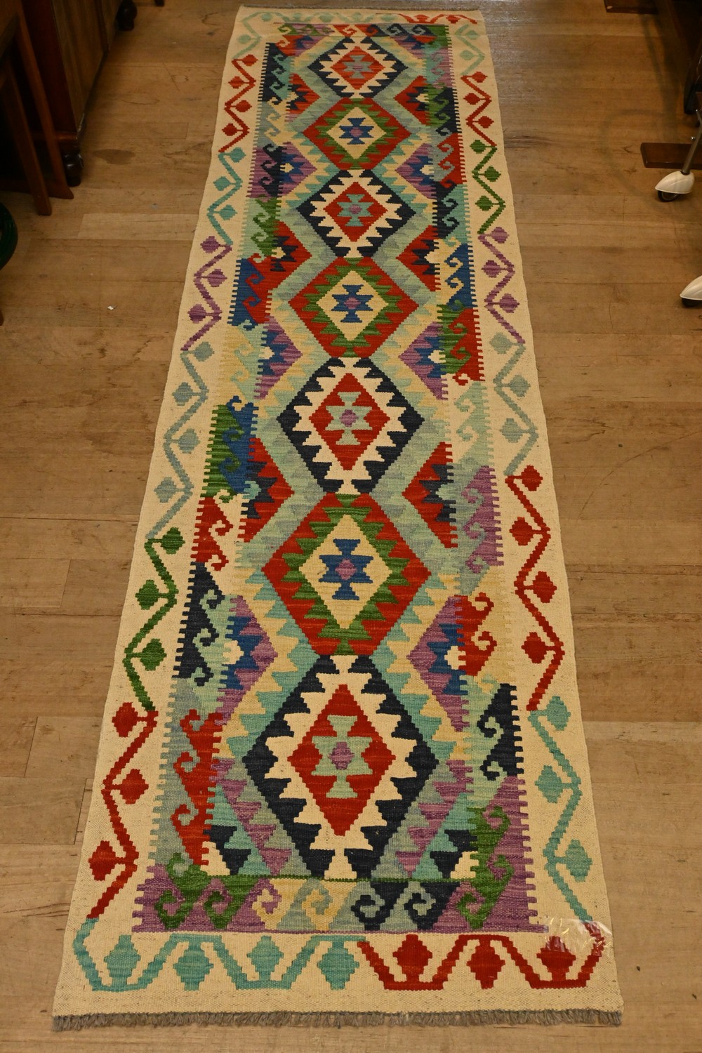 AN AFGHAN KAZAK KILM RUNNER IN CAUCASIAN DESIGN, 100% NATURAL WOOL ON WOOL, VEGETABLES DYES (299 X 78 CM) (LEONARD JOEL DELIVERY SIZE: LARGE)
