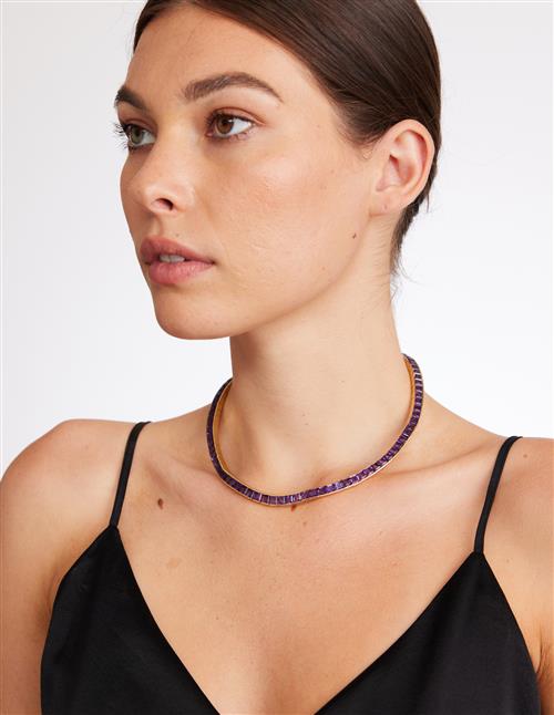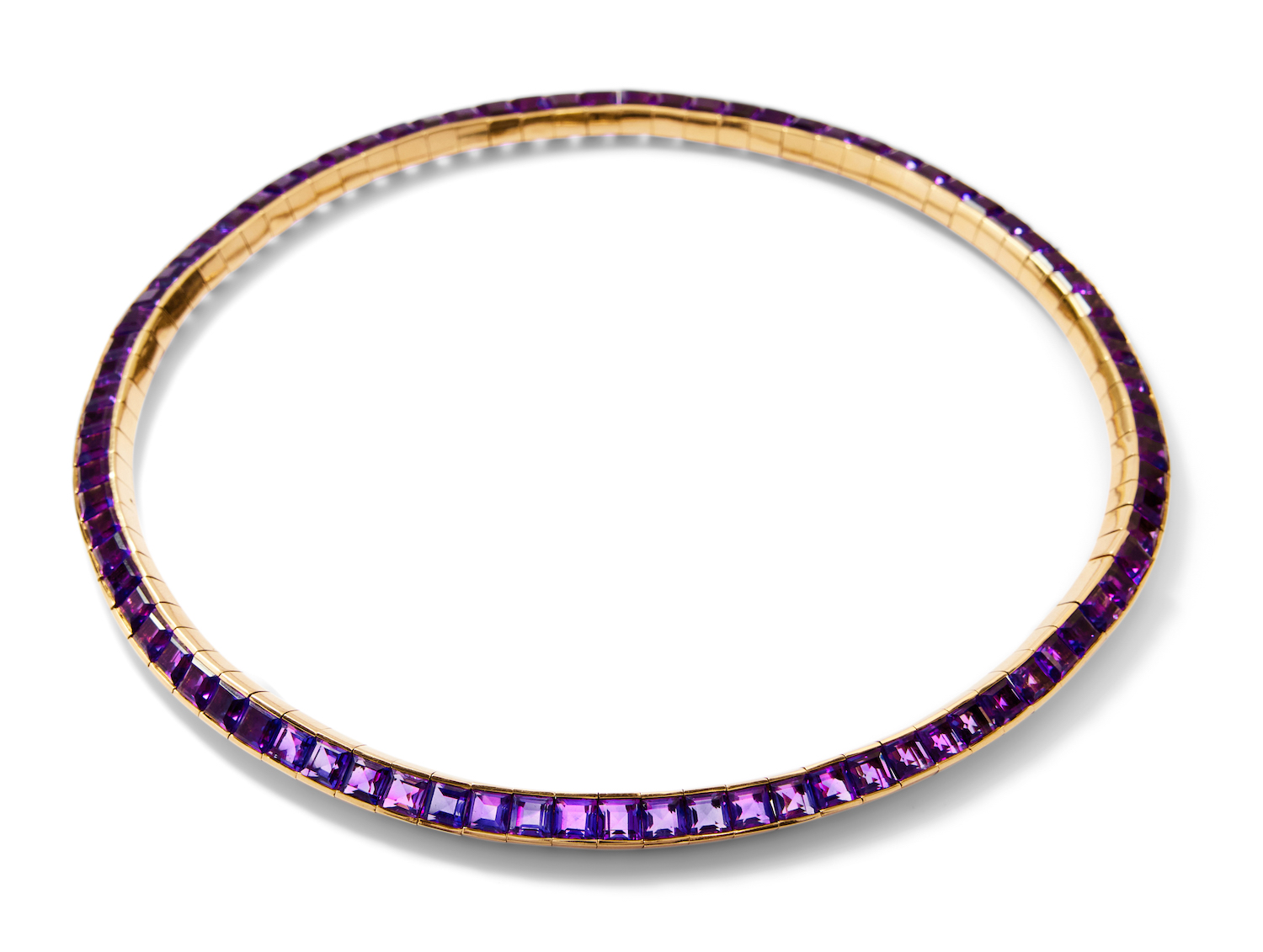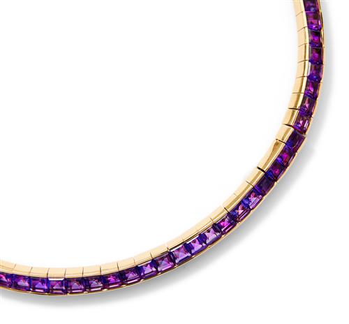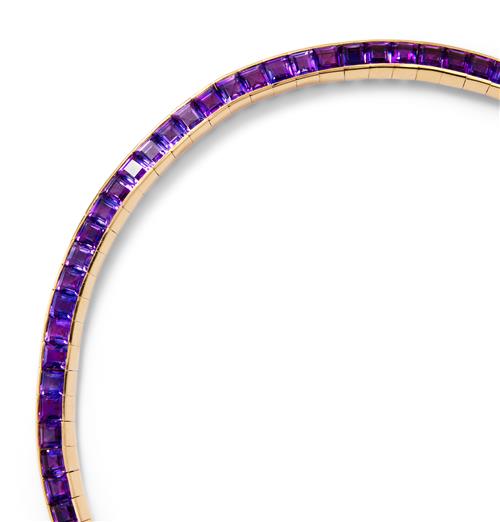 Composed of a line of 84 collet-set carrè-cut amethyst completed by a concealed box clasp, the amethysts together weighing approximately 35.00 carats, mounted in 18ct gold, inner circumference 390mm, gross weight approximately 70 grams.