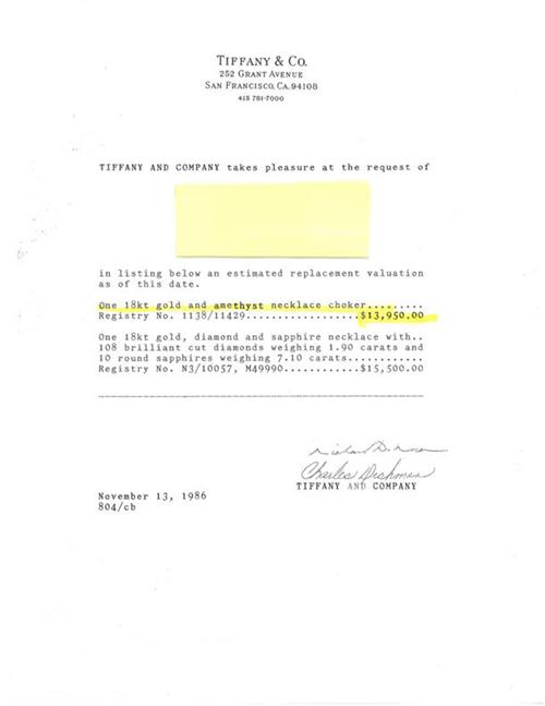 a Tiffany & Co. facsimile retail replacement valuation, numbered 804/CB, dated 13 November 1986;
