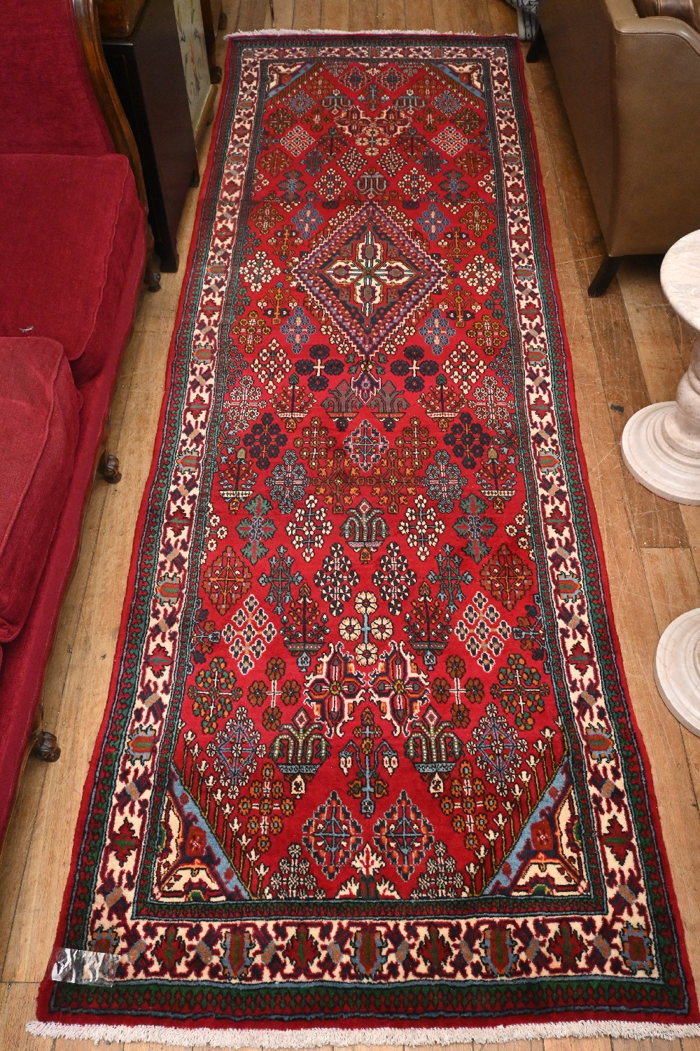 A PERSIAN BAKTIARI WOOLEN RUNNER, 100% HAND KNOTTED WITH BIRDS OF PARIDISE DESIGN, MADE IN IRAN, HEAVY DUTY AND HARD WEARING (321 X 107 CM) (LEONARD JOEL DELIVERY SIZE: LARGE)