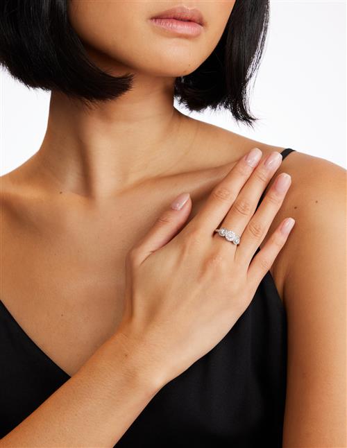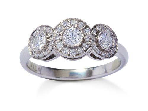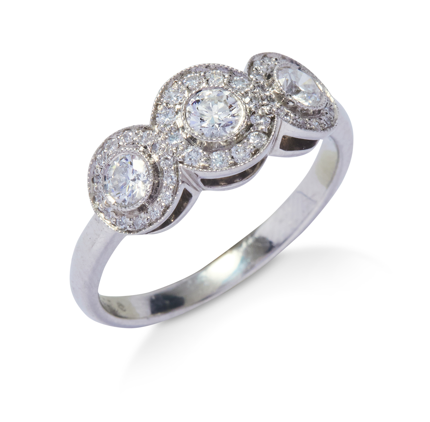 Of cluster design, centring a line of three millegrain-set brilliant-cut diamonds framed by pavé-set diamonds, the diamonds together weighing approximately 0.70 carats, size O, signed Tiffany & Co.