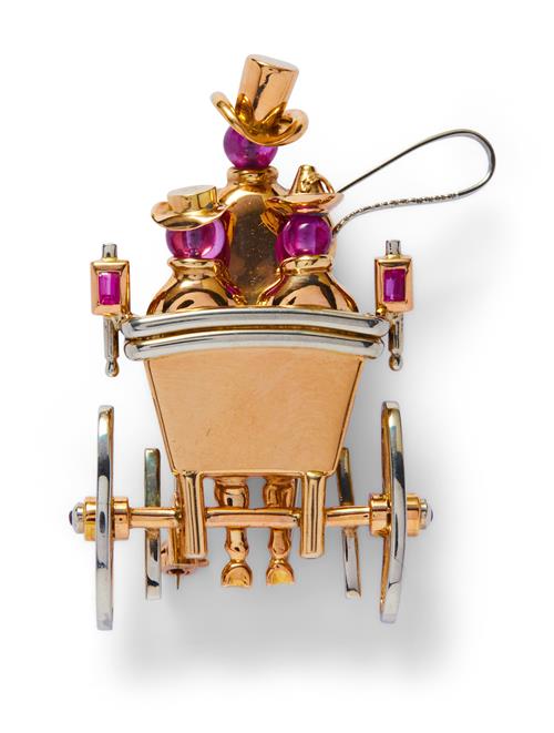 Modelled as the rear of a passenger Hansom Cab decorated at intervals with rubies, length 44mm, width 30mm, trombone clip fitting, numbered, signed J.E.C. & Co. for J.E. Caldwell.