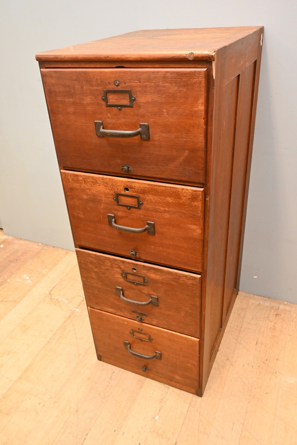 AN AUSTRALIAN OAK FOUR DRAWER FOOLSCAP FILING CABINET (A/F) (130H X 50W X 70D CM) (PLEASE NOTE THIS HEAVY ITEM MUST BE REMOVED BY CARRIERS AT THE CUSTOMER'S EXPENSE. LEONARD JOEL STAFF CANNOT ASSIST CARRYING THIS ITEM) (X-LARGE ITEM)
