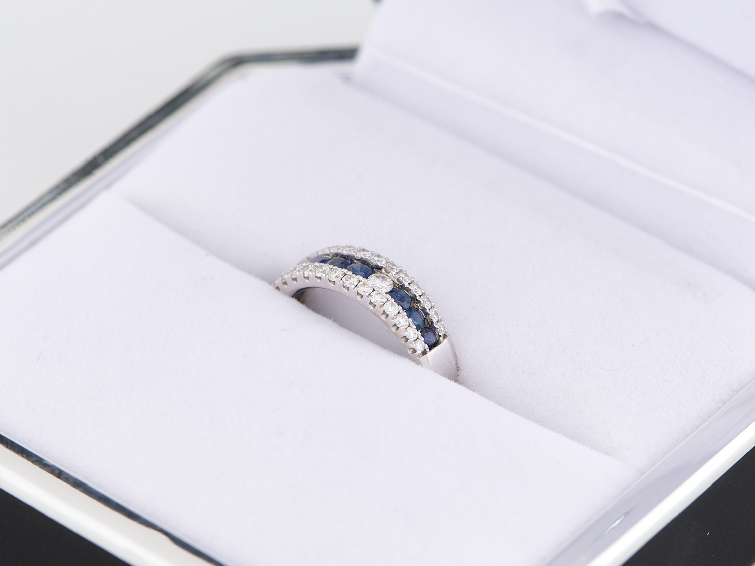 A SAPPHIRE AND DIAMOND SET RING IN 18CT WHITE GOLD, RING SIZE N, BOXED THE DIAMONDS TOTALLING 0.58CTS (F, VS) WITH SAPPHIRES TOTALLING 0.57CTS, BOXED