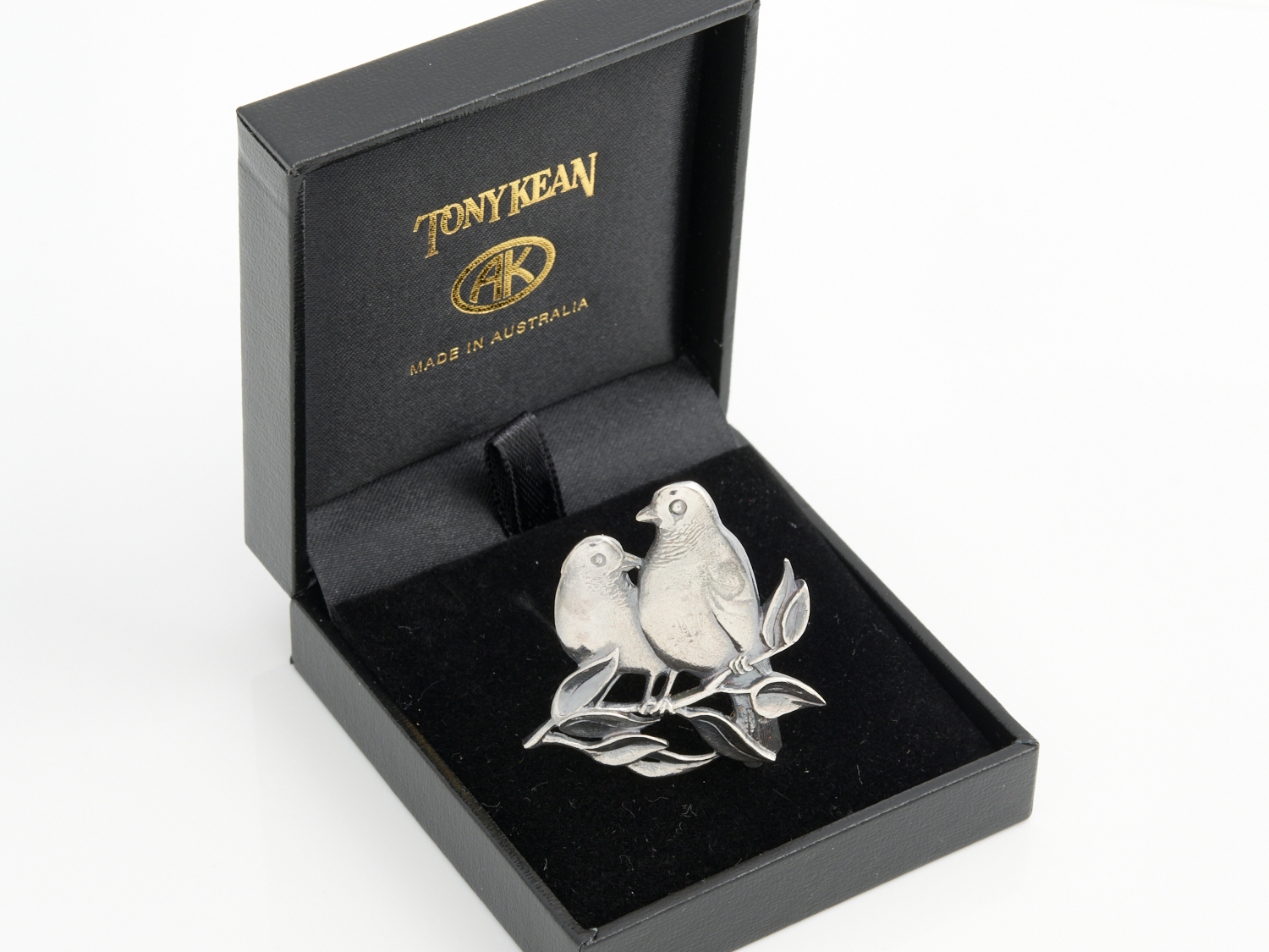 TONY KEAN, A LOVE BIRD BROOCH IN SILVER, 40 X 35MM