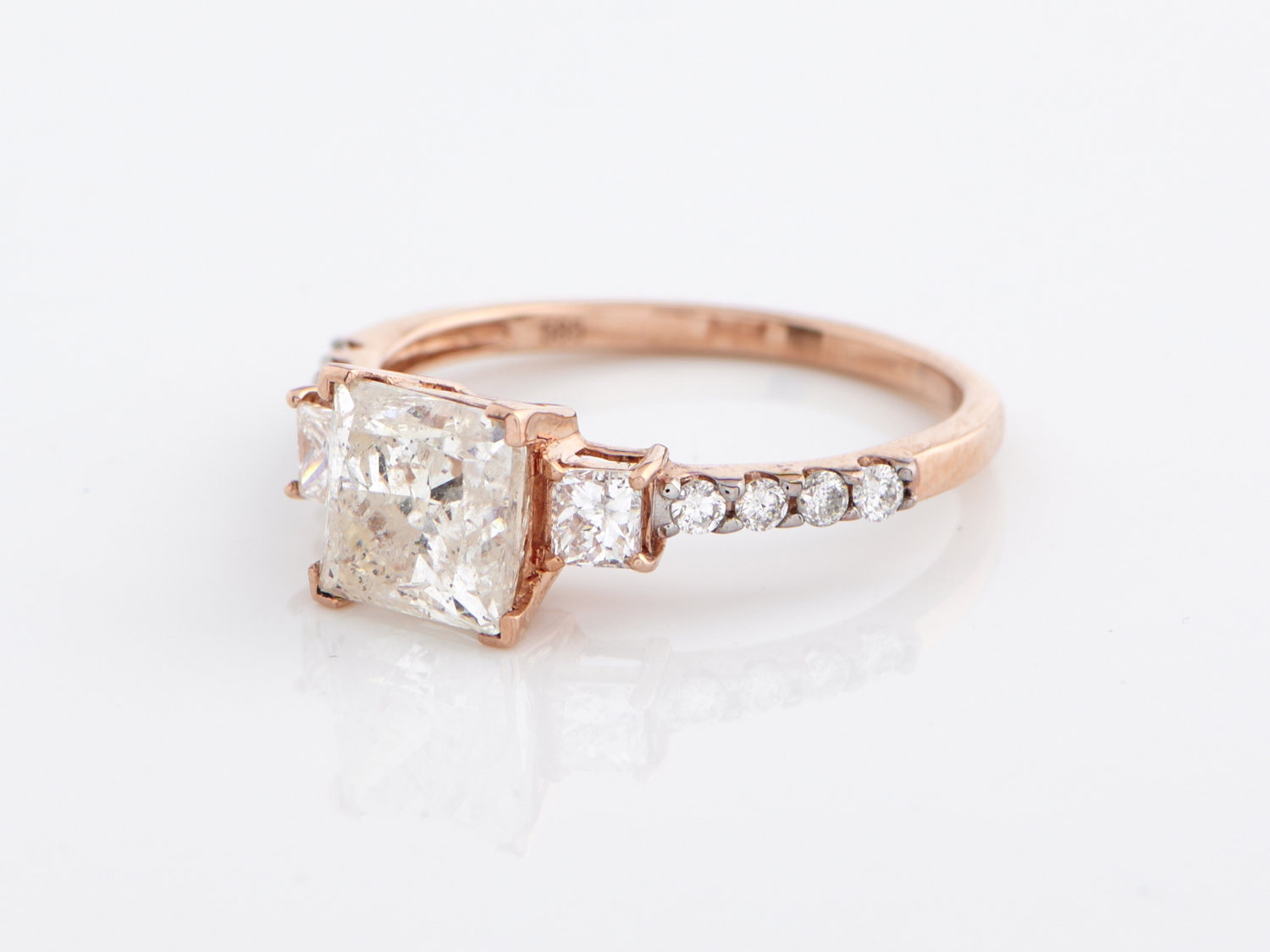 A THREE STONE DIAMOND RING IN 14CT ROSE GOLD, CENTRING A PRINCESS CUT DIAMOND OF APPROXIMATELY 2.14CTS, WITH SMALL SIDE AND SHOULDER DIAMONDS TOGETHER TOTALLING 0.32CTS, RING SIZE N, ACCOMPANIED BY VALUATION