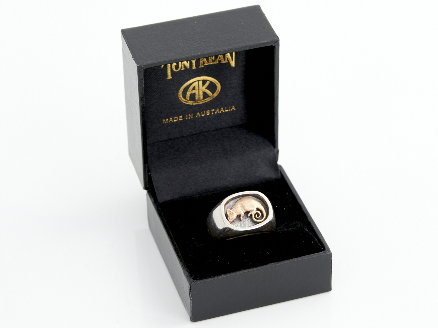 TONY KEAN, A POSSUM SIGNET RING IN STERLING SILVER, RING SIZE O, BOXED