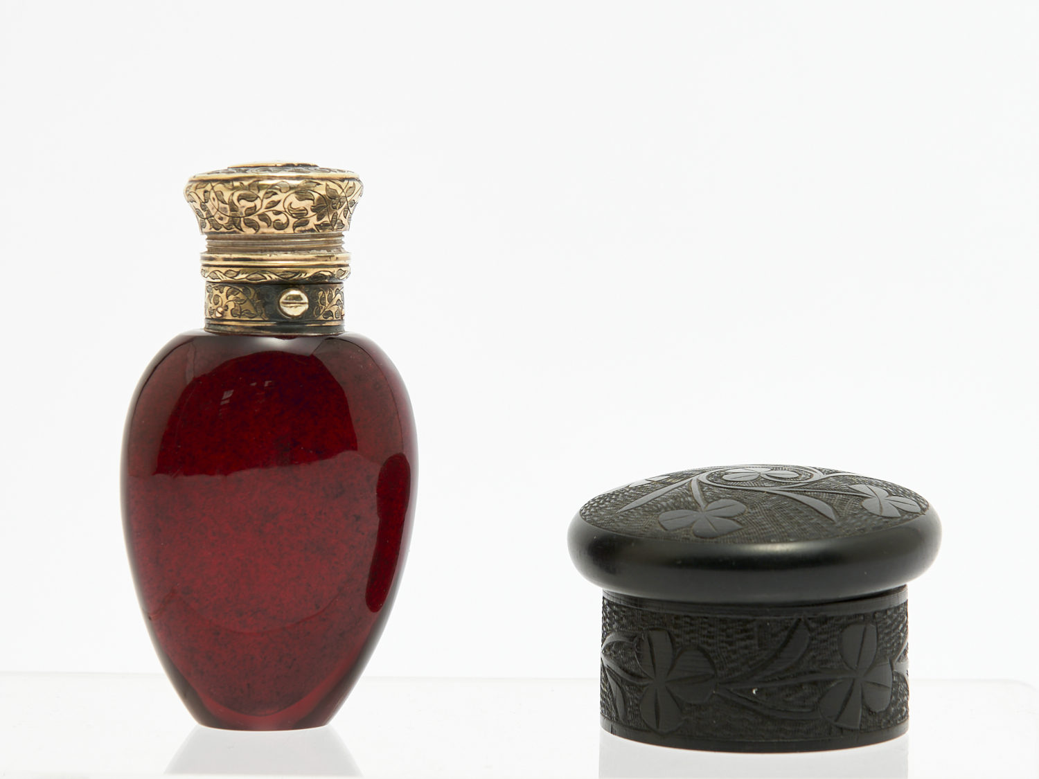 A PERFUME BOTTLE AND A JET CARVED PIN BOX H.9CM, LEONARD JOEL LOCAL DELIVERY: SMALL