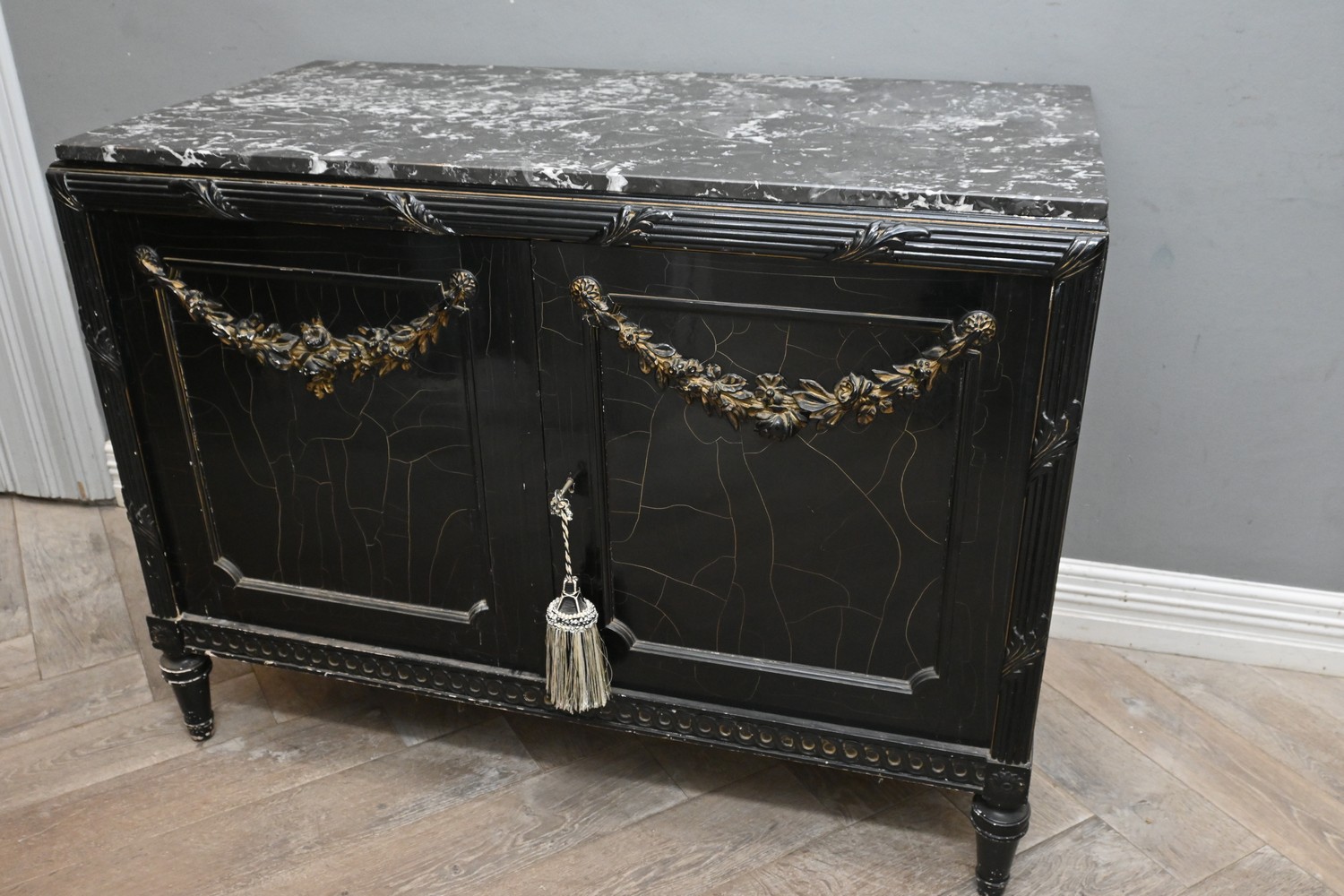A LATE 19th CENTURY FRENCH MARBLE-TOPPED EBONISED SIDE CABINET IN LOUIS XVI MANNER (88H X 117W X 60D CM) (PLEASE NOTE THIS HEAVY ITEM MUST BE REMOVED BY CARRIERS AT THE CUSTOMER'S EXPENSE. LEONARD JOEL STAFF CANNOT ASSIST CARRYING THIS ITEM) (X-LARGE ITEM)