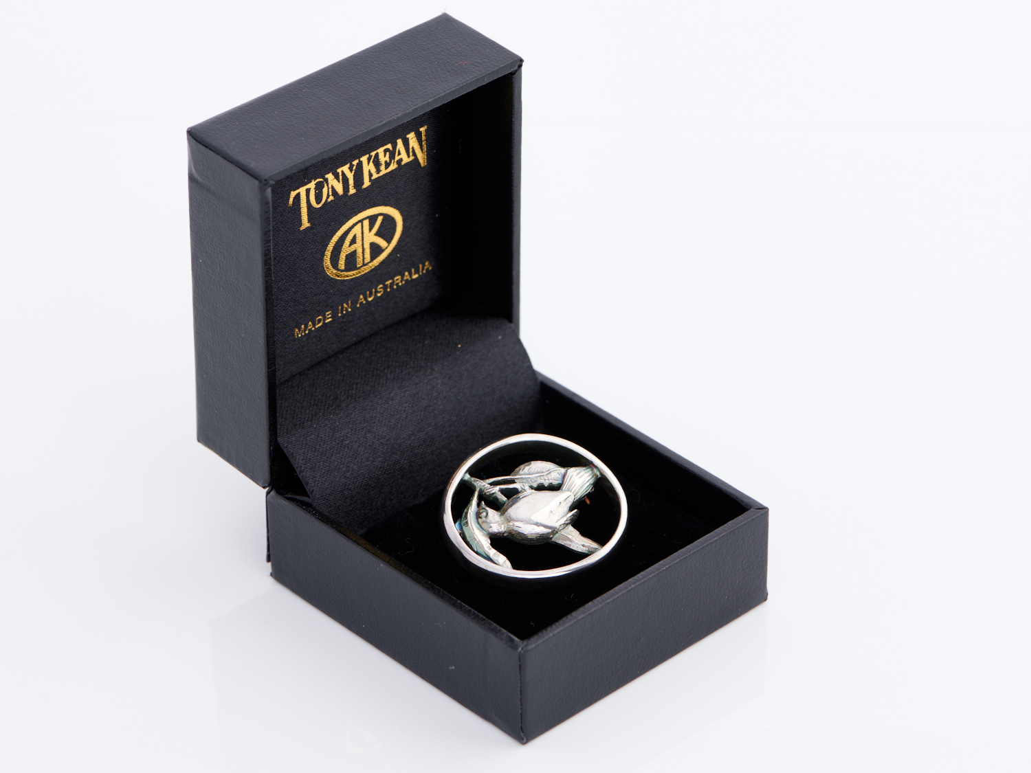 TONY KEAN, AN OVAL HONEY EATER BIRD BROOCH IN STERLING SILVER, 25 X 23MM, BOXED