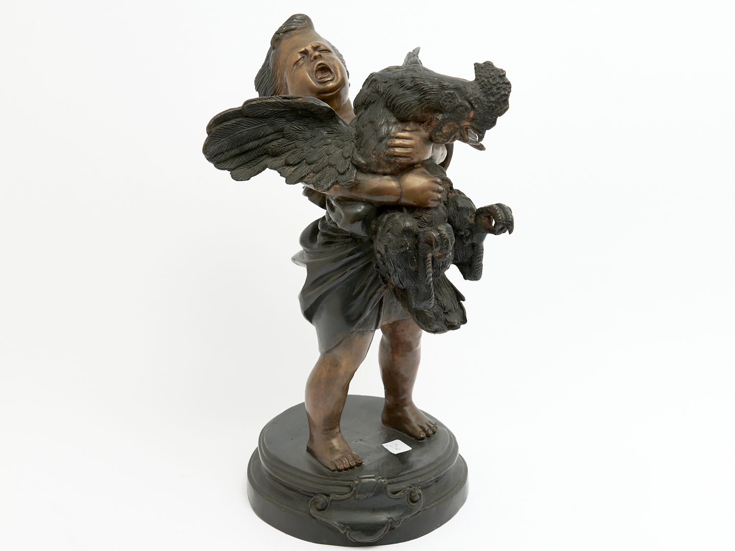 A BRONZE FIGURE OF A CRYING BOY HOLDING A CHICKEN H.45CM, LEONARD JOEL LOCAL DELIVERY: MEDIUM