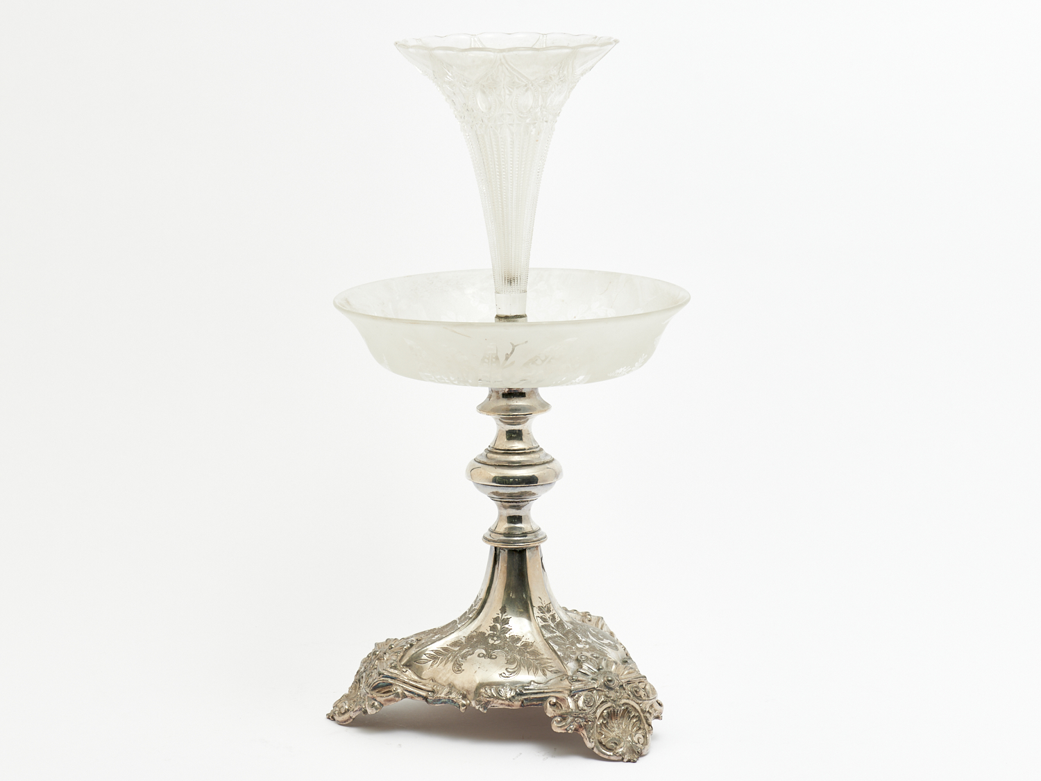 A VICTORIAN SILVERPLATE CENTREPIECE WITH ETCHED GLASS BOWL AND TRUMPET H.46CM , LEONARD JOEL LOCAL DELIVERY: MEDIUM
