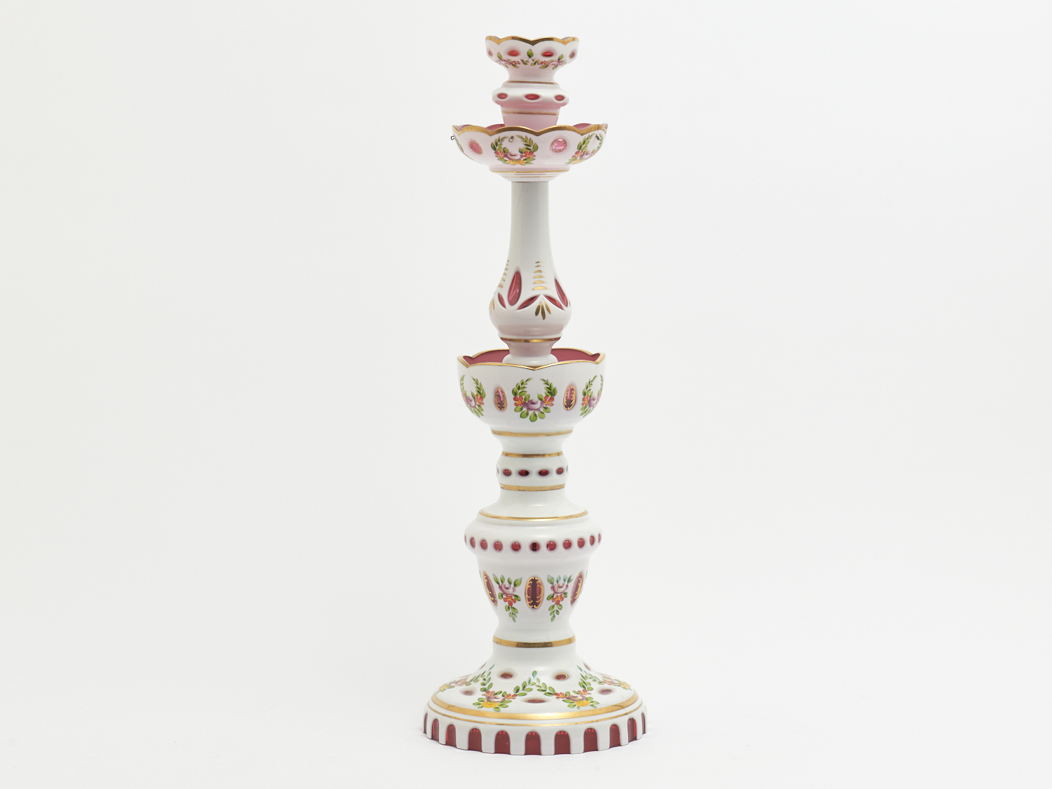 A BOHEMIAN RED AND WHITE GLASS CANDLESTICK (A/F) H.52CM, LEONARD JOEL LOCAL DELIVERY: MEDIUM -TBA
