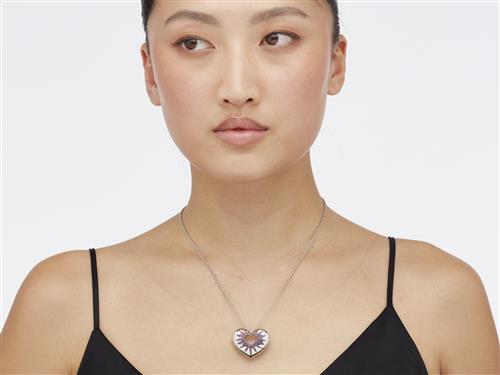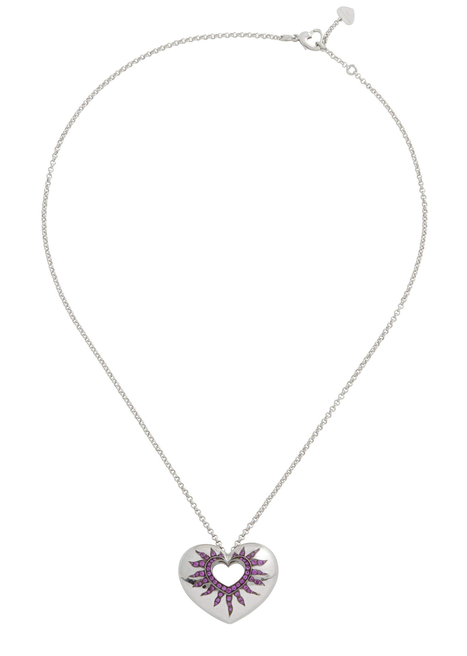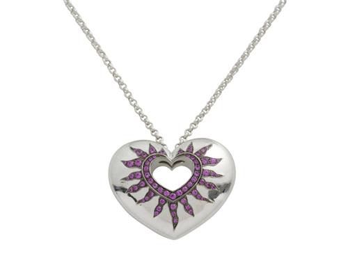 Modelled as an open heart, detailed with circular-cut pink sapphires together weighing approximately 0.60 carats, to a fine belcher link chain completed by a heart shaped parrot clasp, signed Mouawad and numbered M2008878, pendant measuring approximately 28mm x 32mm, chain length approximately 455mm - 470mm adjustable.