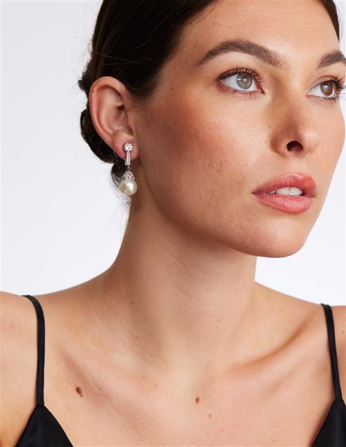 Each terminating on an interchangeable claw-set pear-shaped diamond swing drop weighing 4.72 carats and 4.50 carats respectively, and a pair of Australian South Sea pearls measuring approximately 12mm, surmounted by a bell cap pave-set with diamonds supported from a claw-set brilliant-cut diamond ear stud between a tapered baguette diamond connector, the small diamonds together weighing approximately 5.70 carats, mounted in 18ct white gold, length 33mm, post and scroll fittings (2).
