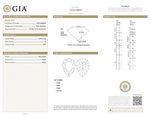 a GIA report numbered 2223438808, dated May 6 2022, stating that the 4.50 carat diamond is natural, G colour, VS1 clarity;