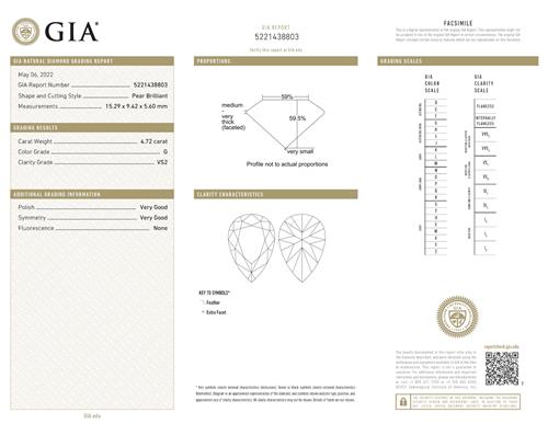 a GIA report numbered 5221438803, dated May 6 2022, stating that the 4.72 carat diamond is natural, G colour, VS2 clarity.