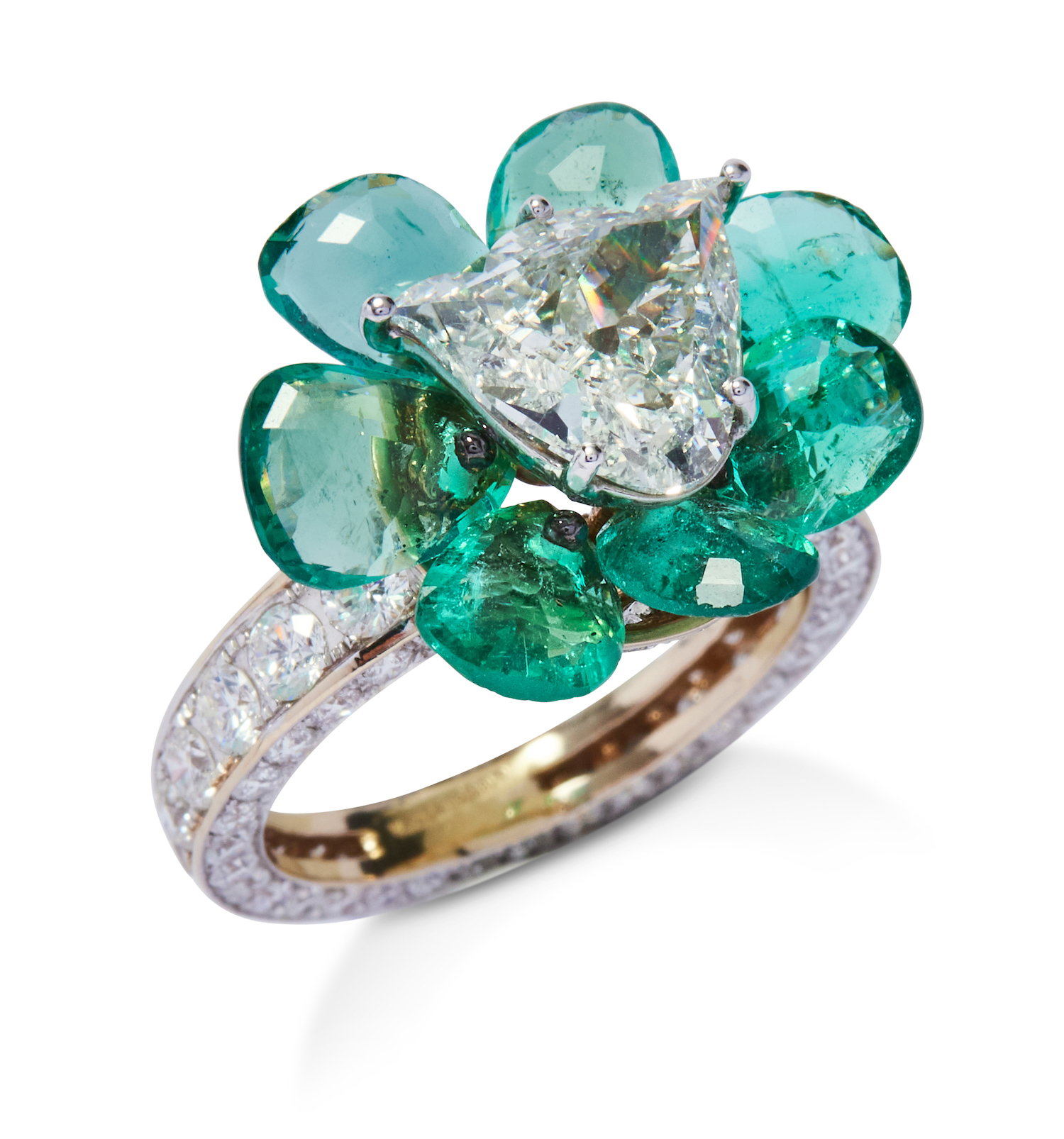 Of cluster design, centring a claw-set tulip-shaped diamond weighing 2.18 carats, framed by a halo of rose-cut emeralds supported from a gallery pavé-set with brilliant-cut diamonds to a half-hoop continuously set with diamonds, the emeralds and small diamonds together weighing approximately 5.40 carats and 2.47 carats respectively, mounted in 18ct white gold, size M.