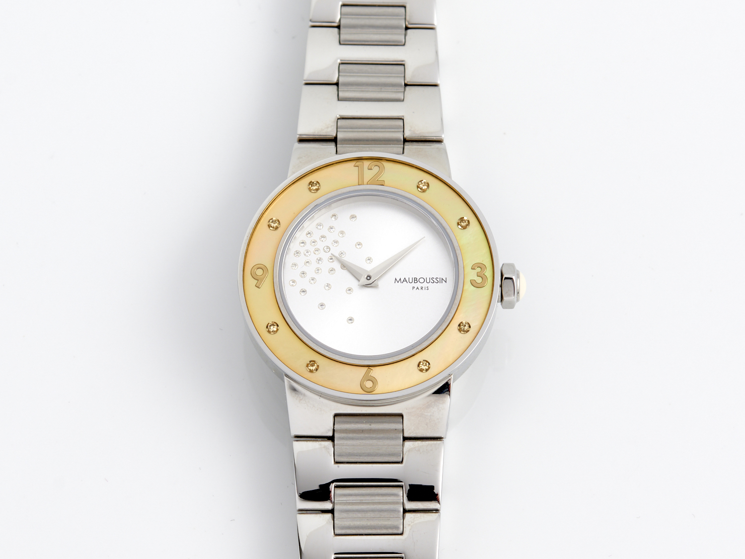 MAUBOUSSIN, 'AMOUR LE JOUR SE LEVE' QUARTZ MOVEMENT WRISTWATCH IN STAINLESS STEEL, WITH MOTHER OF PEARL AND DIAMOND BEZEL