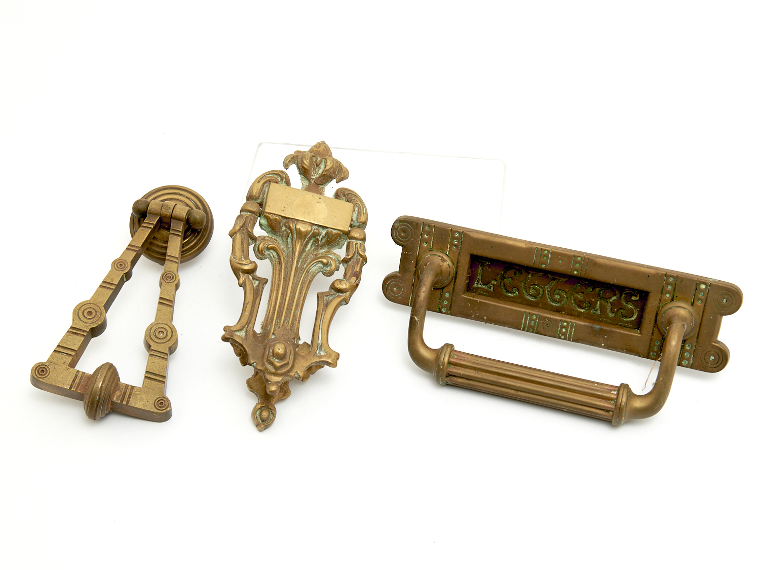 THREE ANTIQUE BRASS DOOR KNOCKERS H.24CM (TALLEST), LEONARD JOEL LOCAL DELIVERY: SMALL