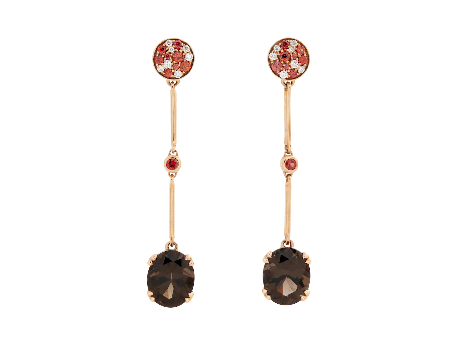 Each earring comprising a claw-set oval-cut smoky quartz, suspended below a double knife edge drop centring a single bezel-set orange sapphire, to a circular pavé-set diamond and orange sapphire surmount, the smokey quartz together weighing approximately 5.60 carats, to post and la pousette fittings, signed Mauboussin and numbered AN6971, length approximately 56mm.