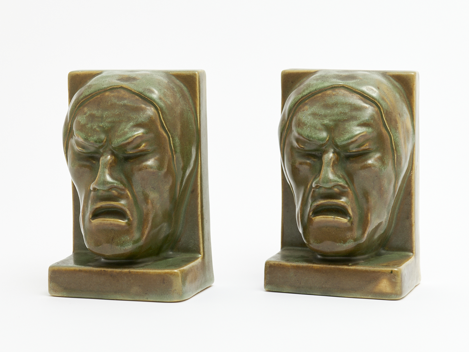 A PAIR OF MELROSE WARE "TRAGEDY", GREEN GLAZED POTTERY BOOKENDS, STAMPED "MELROSE WARE, AUSTRALIAN" H.17.3CM, LEONARD JOEL LOCAL DELIVERY: SMALL