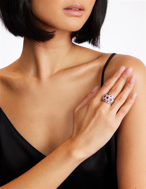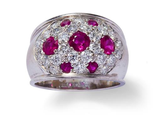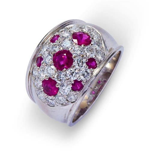 Of tapering bombé form, the 15mm wide hoop is pavé-set to the top with seven circular-cut rubies between pavé-set brilliant-cut diamonds, the rubies and diamonds together weighing approximately 2.26 carats and 1.30 carats respectively, mounted in 18ct white gold, size R1/2, signed WHITE for Tony White.