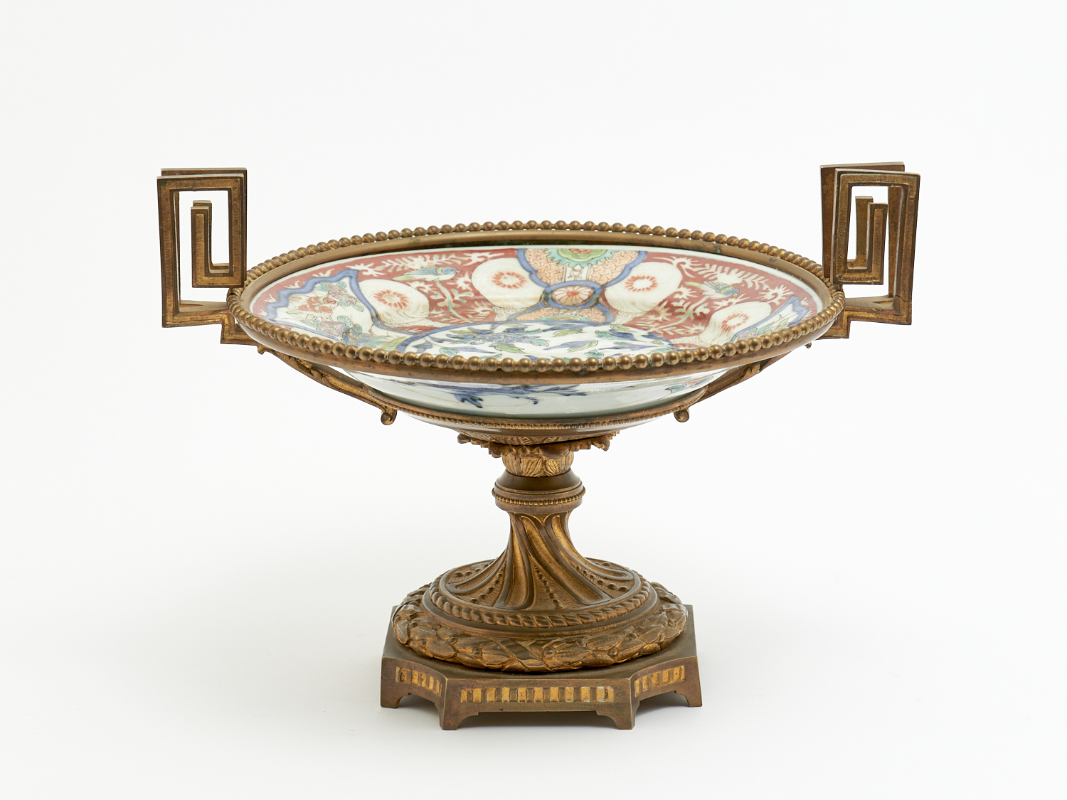 A 19TH CENTURY FRENCH ORMOLU CENTREPIECE ENCLOSING A JAPANESE KUTANI PLATE (A/F) H.22.5 X W.31.5CM, LEONARD JOEL LOCAL DELIVERY: MEDIUM