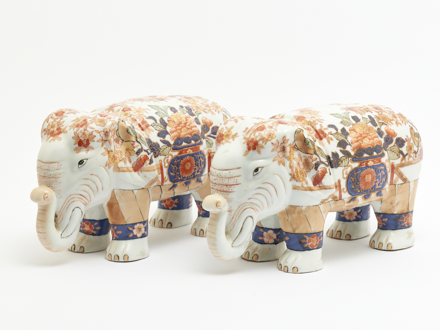 A PAIR OF DECORATIVE PORCELAIN ELEPHANTS L.32CM, LEONARD JOEL LOCAL DELIVERY: MEDIUM