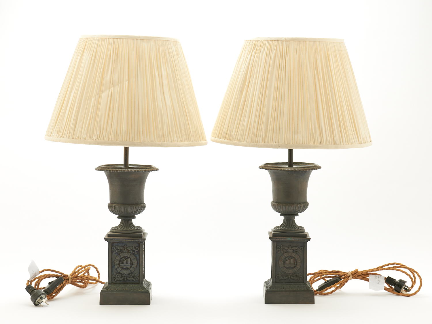 A PAIR OF METAL NEOCLASSICAL STYLE CAMPAGNE URN LAMP BASES WITH PLEATED SHADES H.64CM, LEONARD JOEL LOCAL DELIVERY: MEDIUM