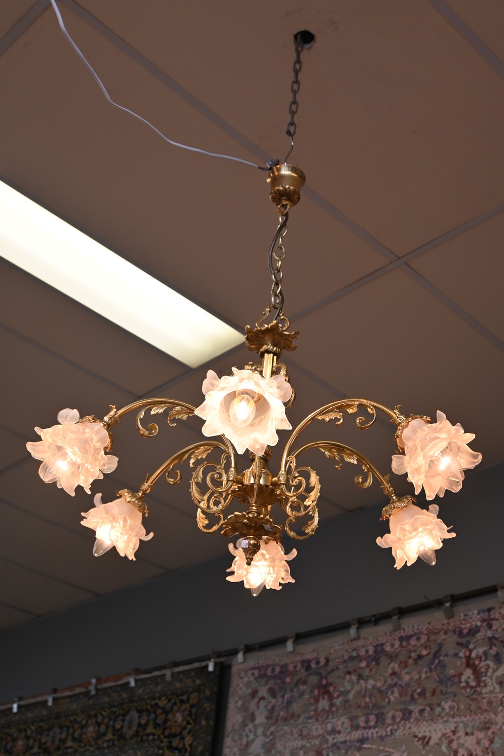 AN ITALIAN SIX LIGHT BRASS CHANDELIER WITH MOULDED GLASS SHADES (85H X 70DIA CM) (PLEASE NOTE THIS HEAVY ITEM MUST BE REMOVED BY CARRIERS AT THE CUSTOMER'S EXPENSE. LEONARD JOEL STAFF CANNOT ASSIST CARRYING THIS ITEM) (X-LARGE ITEM)
