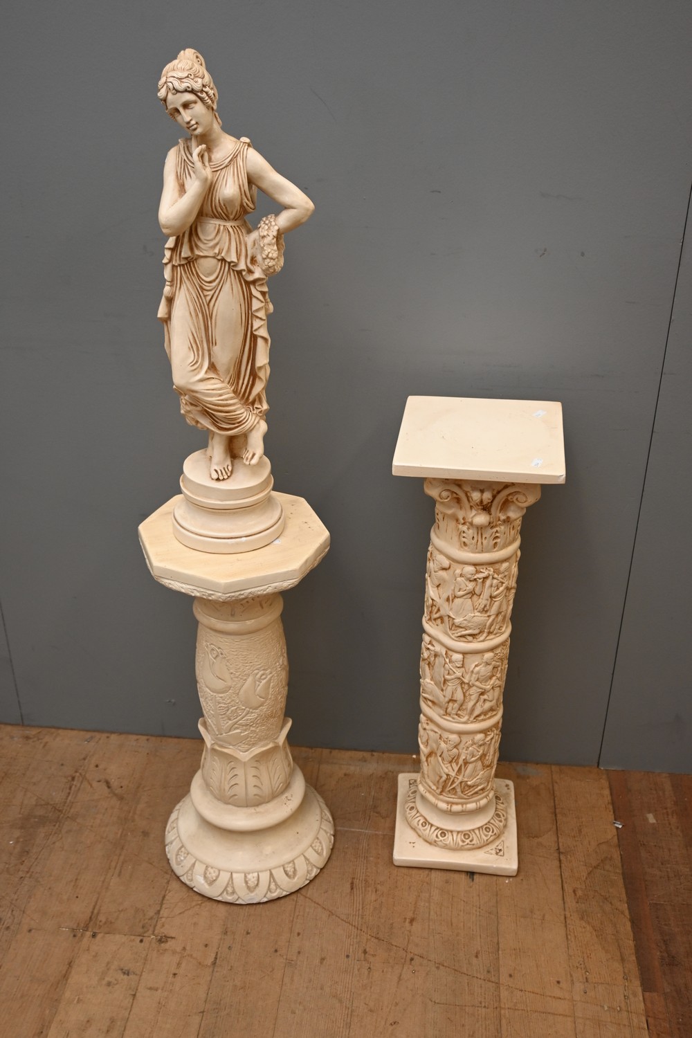 TWO COMPOSITE PEDESTALS TOGETHER WITH CLASSICAL FIGURE (A/F) (127H X 23DIA CM) LEONARD JOEL DELIVERY SIZE: X-LARGE)