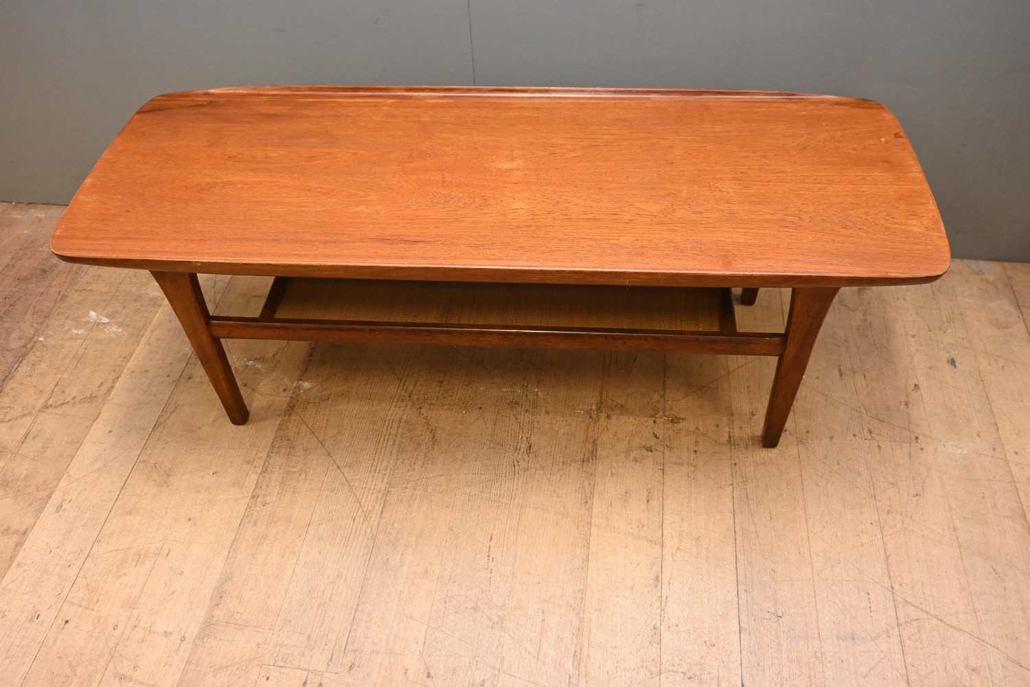 A MID-CENTURY TEAK TWO TIER COFFEE TABLE (A/F) (40H X 122W X 45D CM) (LEONARD JOEL DELIVERY SIZE: LARGE)
