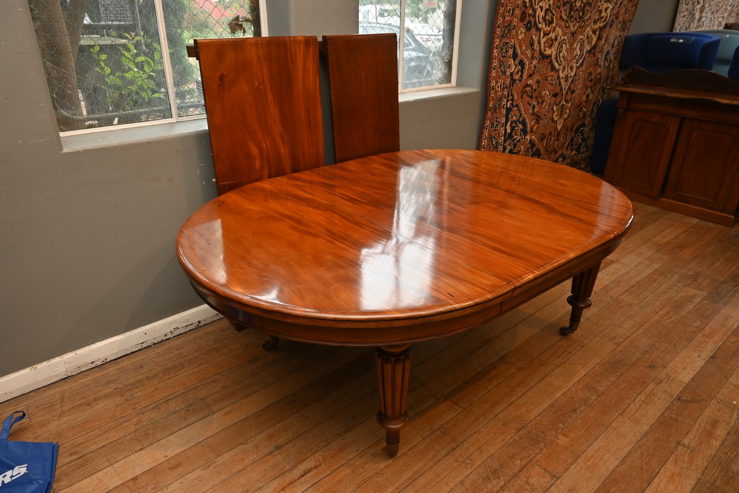A VICTORIAN MAHOGANY EXTENDIG DINING TABLE, WITH TWO SPARE LEAVES (A/F) (75H X 197W X 137D CM) (PLEASE NOTE THIS HEAVY ITEM MUST BE REMOVED BY CARRIERS AT THE CUSTOMER'S EXPENSE. LEONARD JOEL STAFF CANNOT ASSIST CARRYING THIS ITEM) (X-LARGE ITEM)
