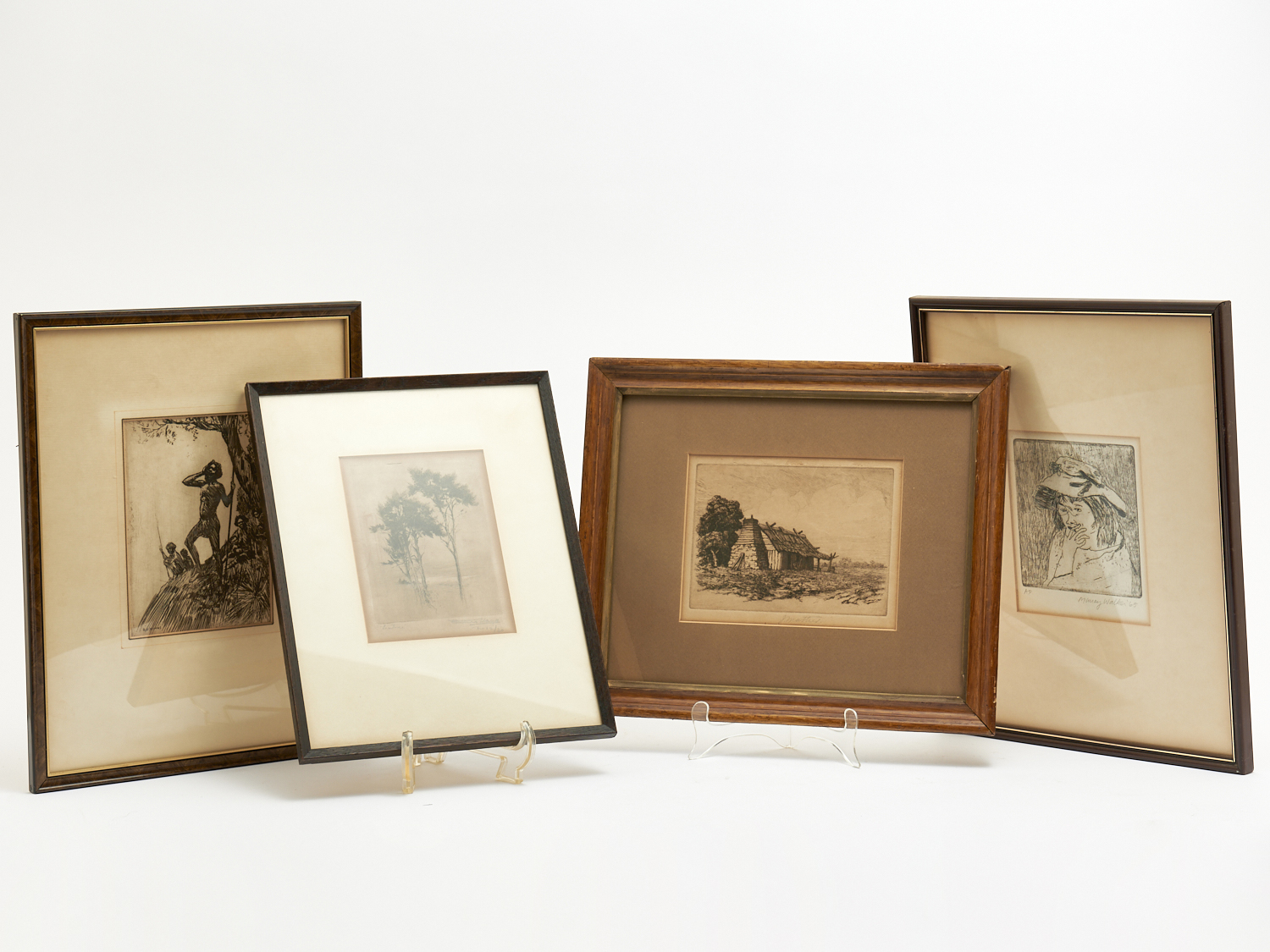 A GROUP OF FOUR ETCHINGS BY VARIOUS ARTISTS INCLUDING B.E. MINNS, CONNIE LLOYD AND JOHN MATHER H.39.5 X W.37CM (LARGEST), LEONARD JOEL LOCAL DELIVERY: SMALL