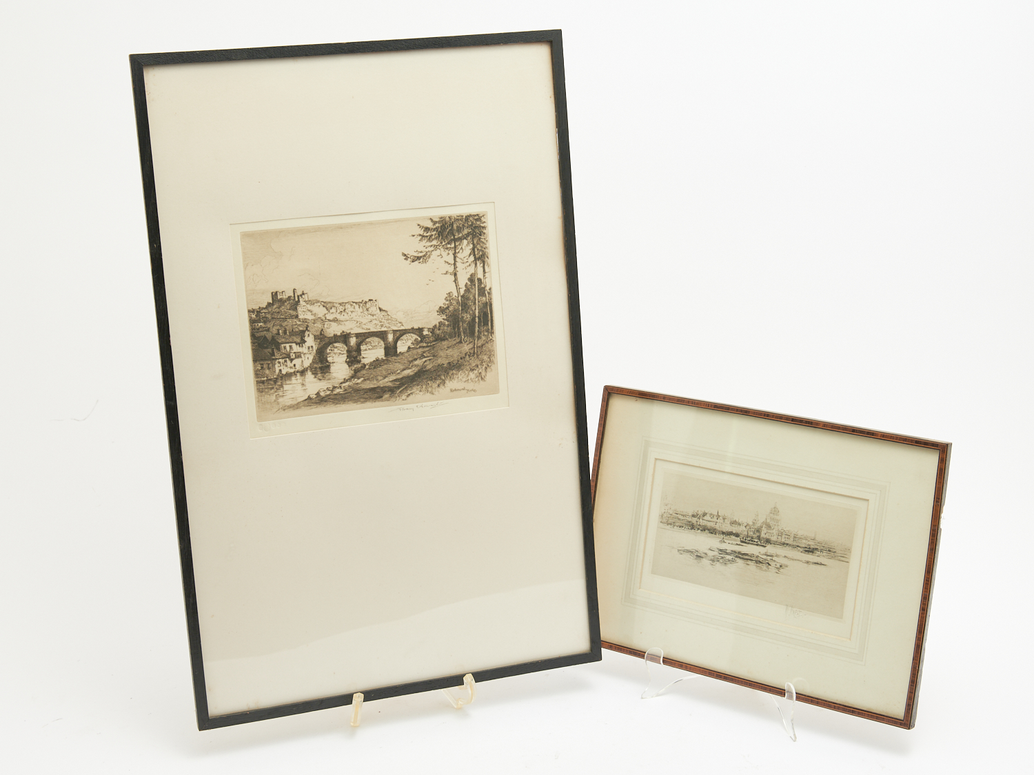 TWO ETCHINGS - WILLIAM WALCOT, 'THE THAMES FROM WATERLOO BRIDGE', AND ALBANY HOWARTH, 'RICHMOND, YORKSHIRE' H.53 X W.34CM (LARGEST), LEONARD JOEL LOCAL DELIVERY: SMALL